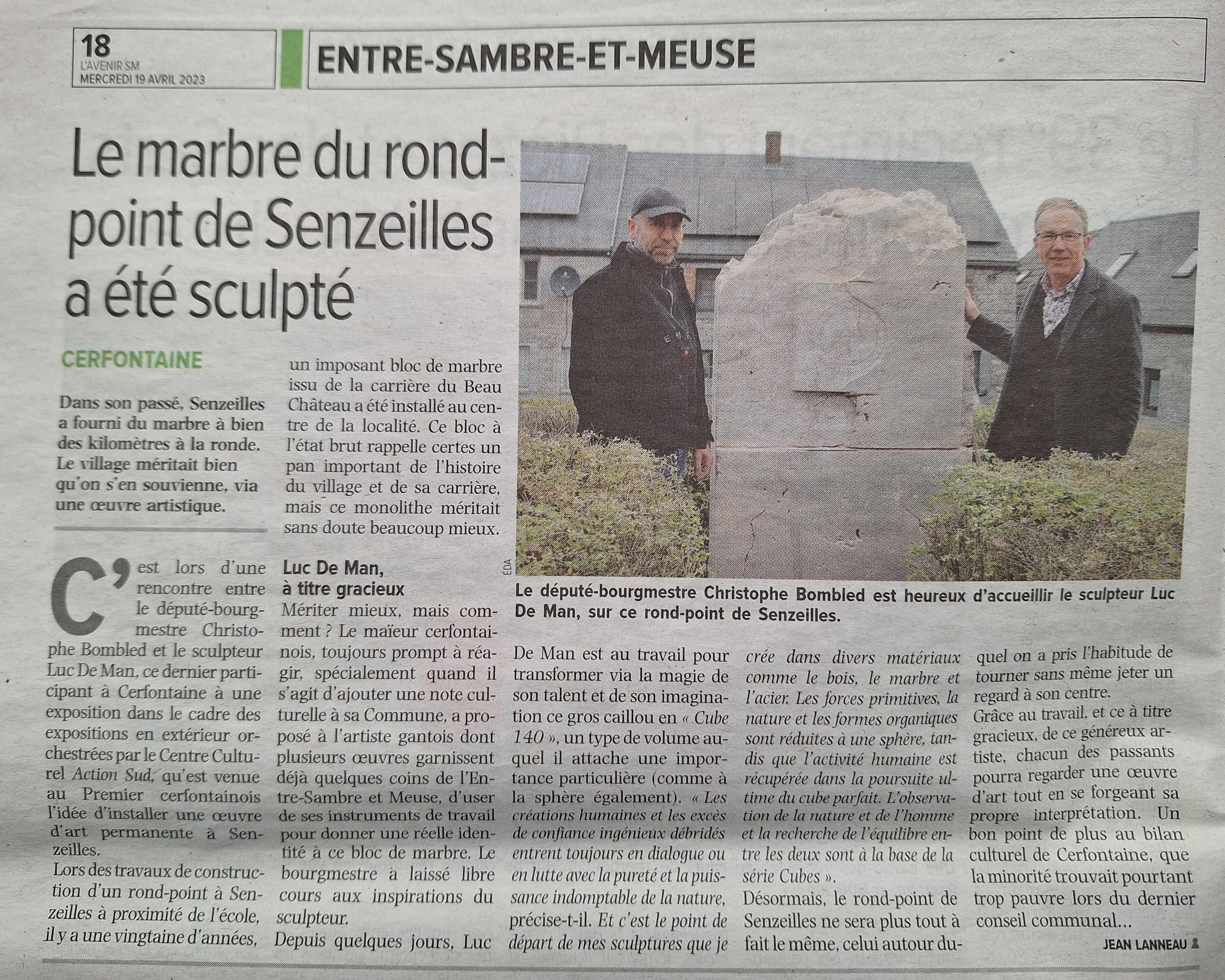 - Le marbre du rondpoint de Senzeilles a été sculpté, l'Avenir, 19 avril 2023
